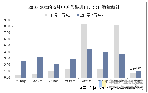 2022年我国芒果的进口数量为8。23万吨,进口额为0。57亿美元;出口数量为3。77万吨,出口额为0。58亿美元。
