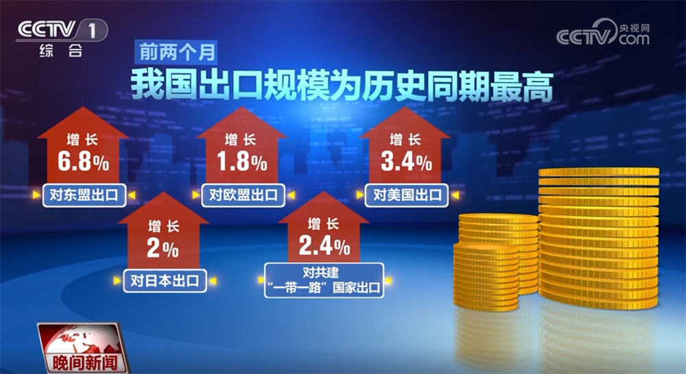 海关总署3月7日发布,据海关统计,本年前两个月,我国货色商业进出口总值6。54万亿元。此中出口3。88万亿元,增加3。4%;进口2。66万亿元,下降7。3%。我国出口规模为汗青同期最高。此中,欧盟、美国、日本出口别离增加6。8%、1。8%、3。4%、2%,对共建“一带一”国度出口增加2。4%。