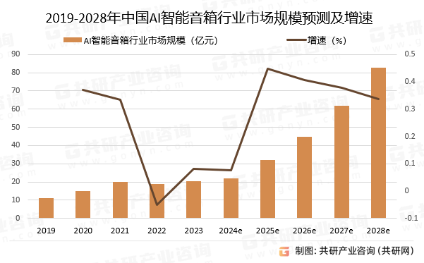 跟着科技的前进和消费者对智能化糊口体例的逃求,智能家居产物逐步成为家庭标配。AI智能音箱做为智能家居系统中的主要一环,凭仗其便利的操做和强大的语音交互功能,成为了浩繁家庭首选的智能设备。2019-2023年,我国AI智能音箱行业市场规模由10。95亿元增加至20。54亿元,期间年复合增加率17。04%;估计2024-2028年,我国AI智能音箱行业市场规模由22。09亿元增加至82。82亿元,期间年复合增加率39。15%。