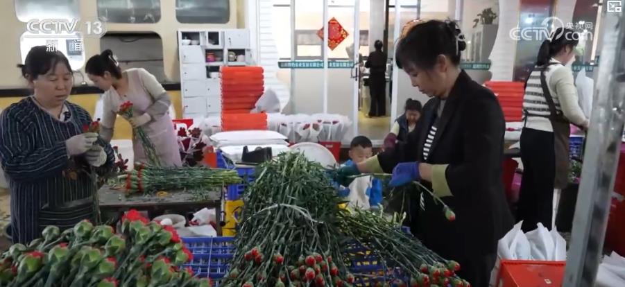 正在昆明一家花草商业公司,记者看到,工人们正加班加点对方才集中采购回来的康乃馨进行二次分级包拆。